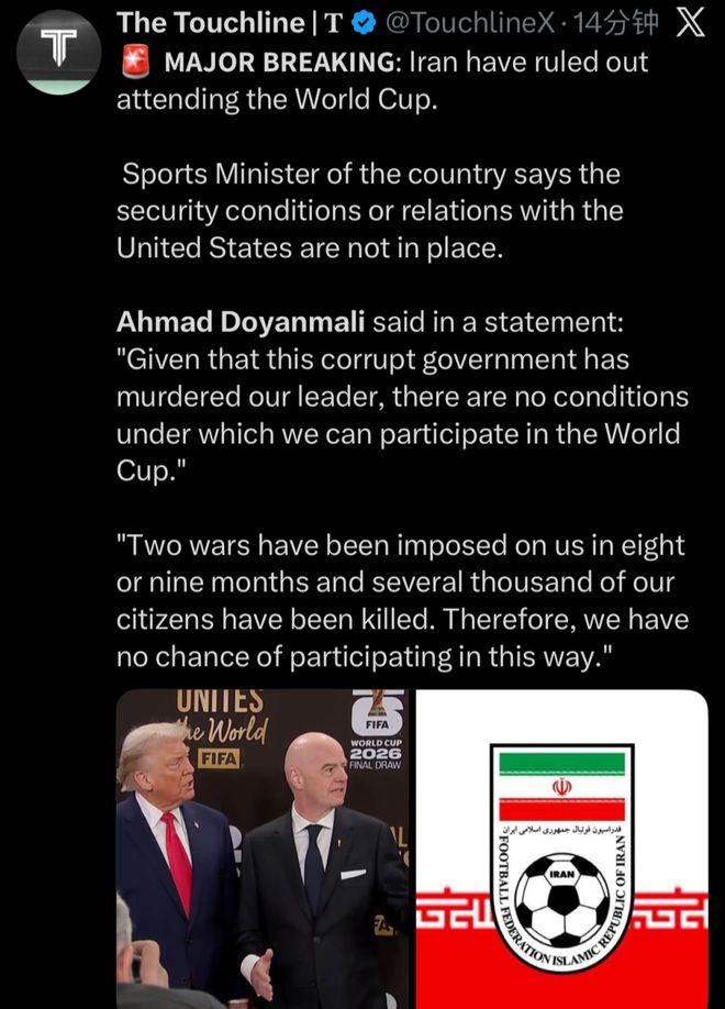 现在距离2026年美加墨世界杯开幕,还有不到100天的时间,不过国际足联现在面临一个难题,有可能调整参赛队伍,因为伊朗男足参赛的可能性越来越小。